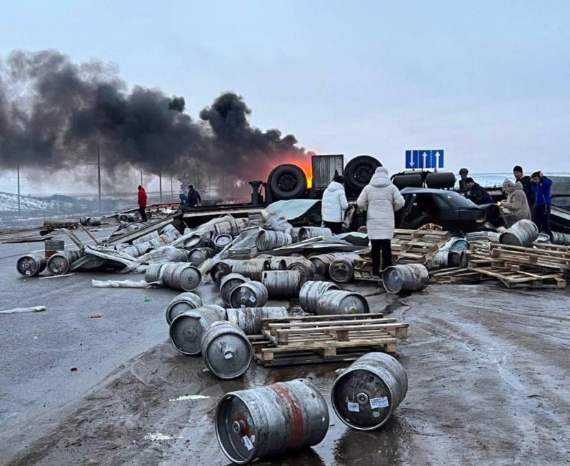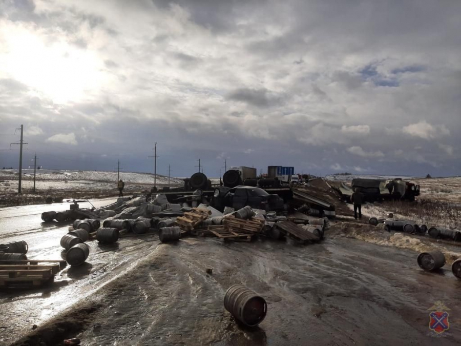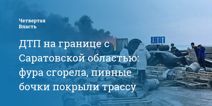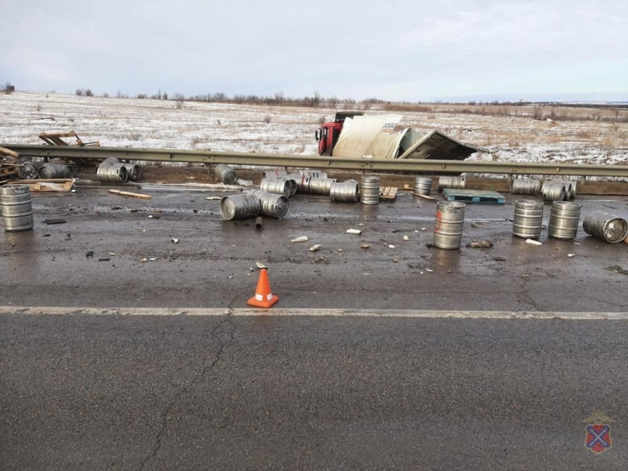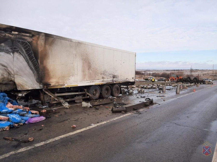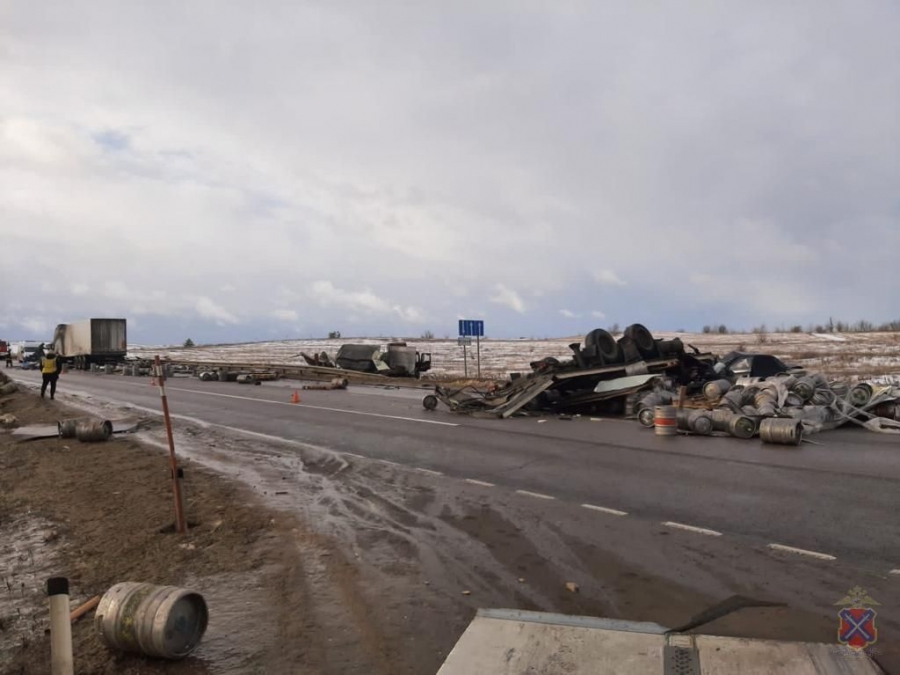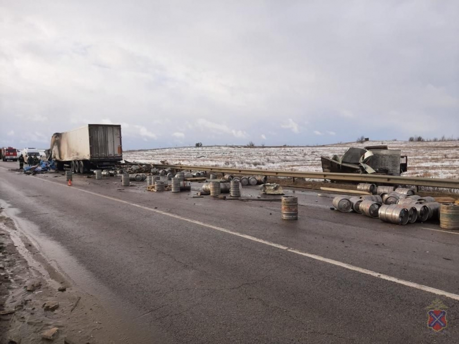 ДТП на границе с Саратовской областью: фура сгорела, пивные бочки покрыли трассу