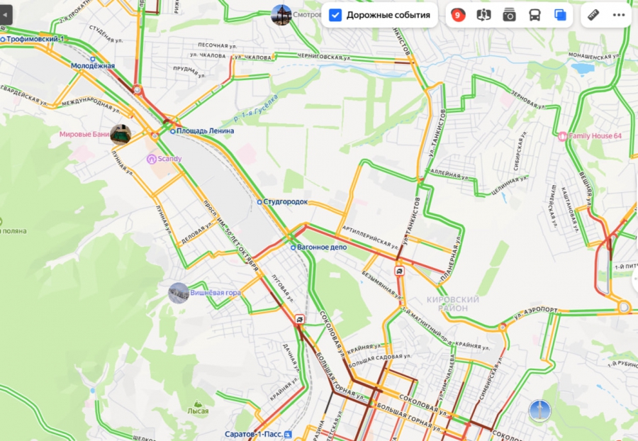 Огромные заторы, вероятно, возникли из-за ухудшения погодных условий и выпадения снега. Пробки фиксировали на многих важных магистралях города: проспект 50 лет Октября, Большая Горная, Соколовая, Чапаева, Астраханская и других.
