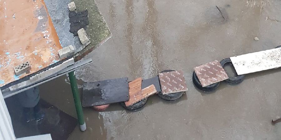 Напомним, от жителей дома №52 по улице Полтавской поступила жалоба на то, что уже неделю территория у пятиэтажки подтоплена. Для передвижения по образовавшемуся озеру жильцы соорудили тропинку из шин и досок.