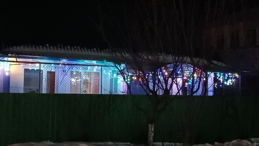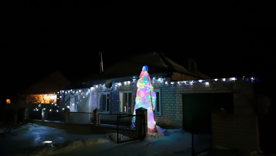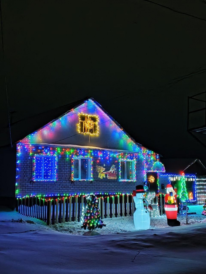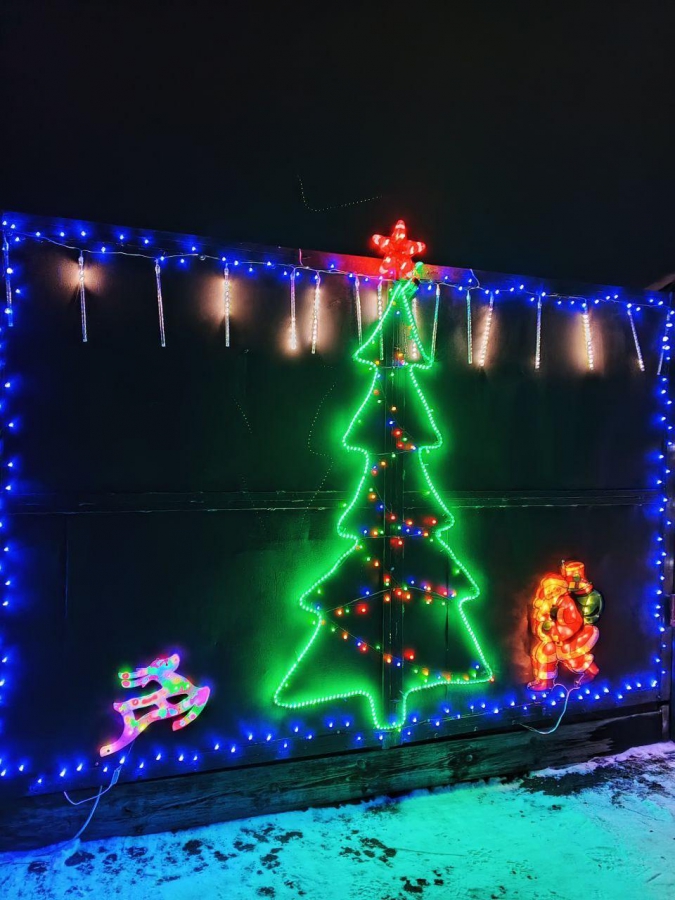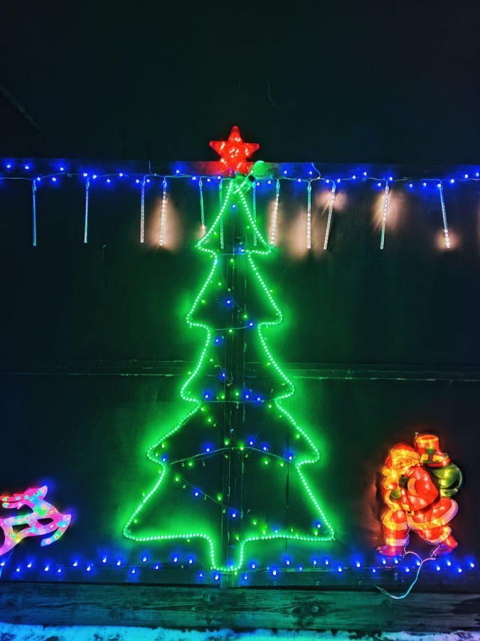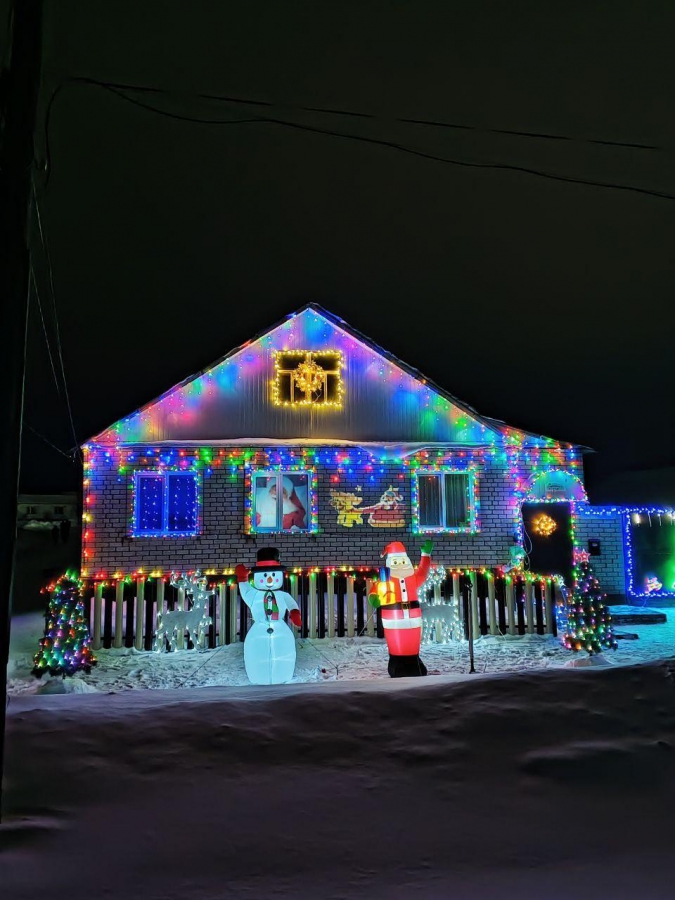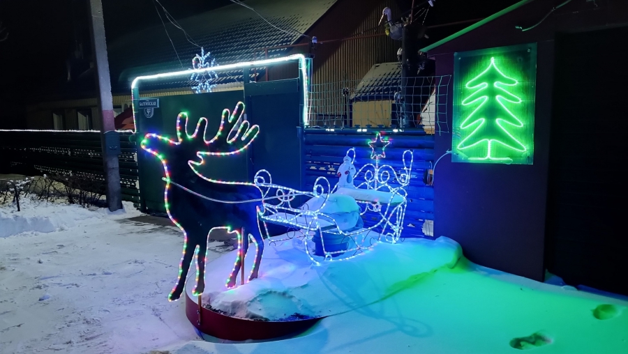 Один из местных жителей Алексей Ивойлочев сотворил новогоднюю сказку возле своего частного дома. Мужчина повесил большое количество гирлянд на забор и фасад здания, а на стену дома он через проектор вывел изображение Деда Мороза на санях, запряженных оленями. Перед участком сельчанин разместил две светящиеся фигуры снеговика и Деда Мороза, высота которых почти что в человеческий рост. Там же появились и украшенные елочки, подарки, шарики на лавочке и фигуры оленей.