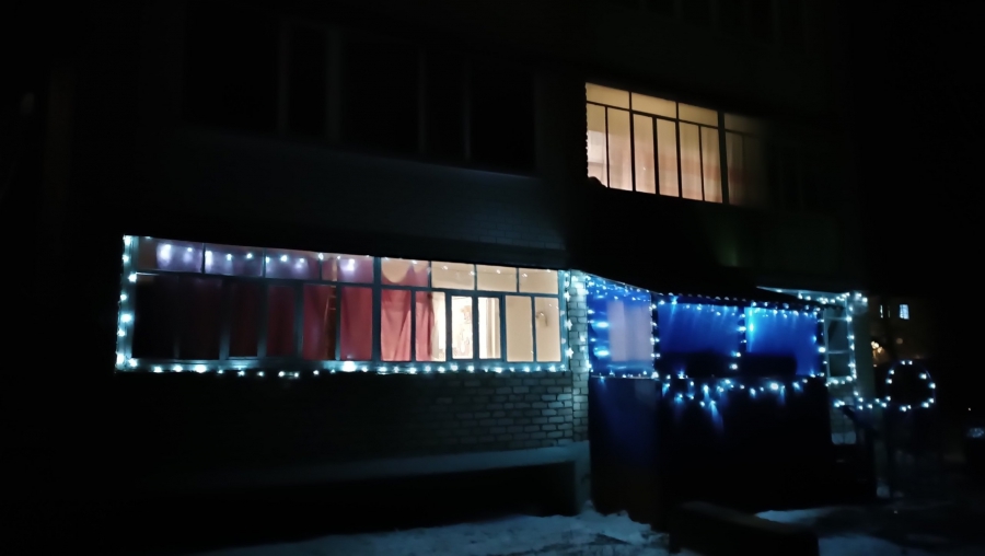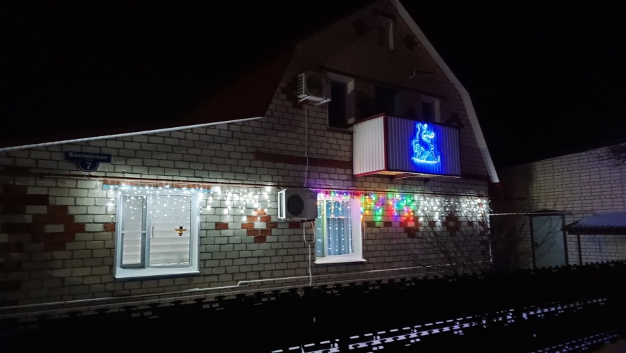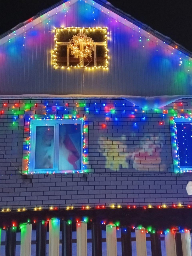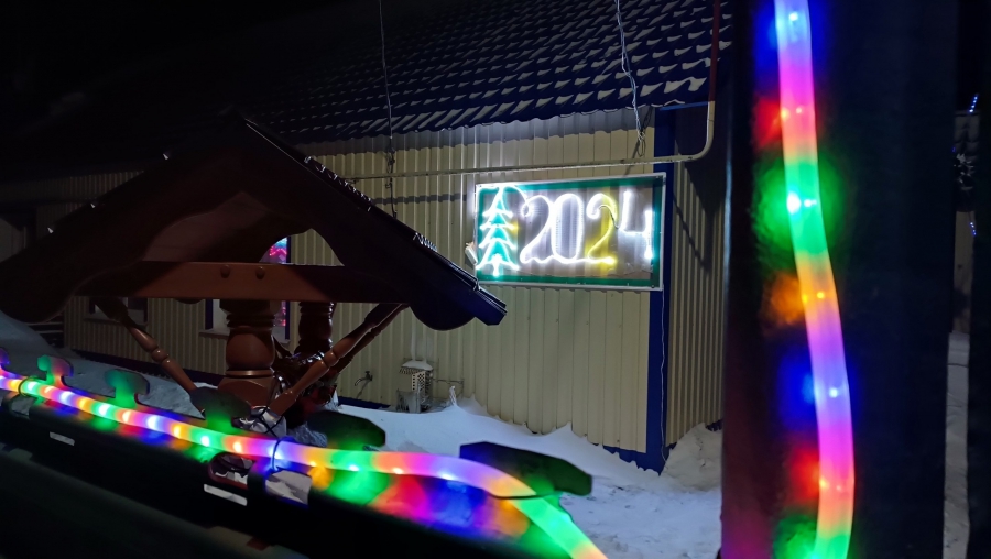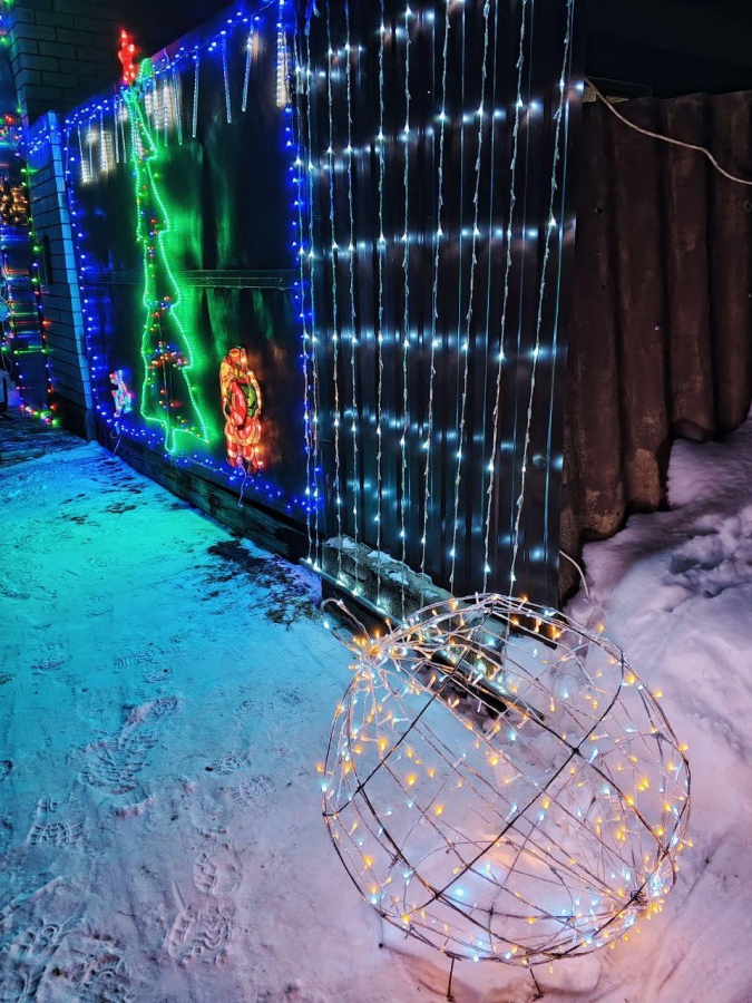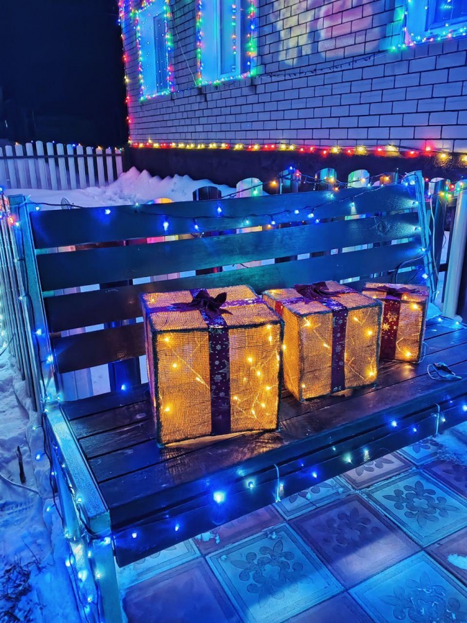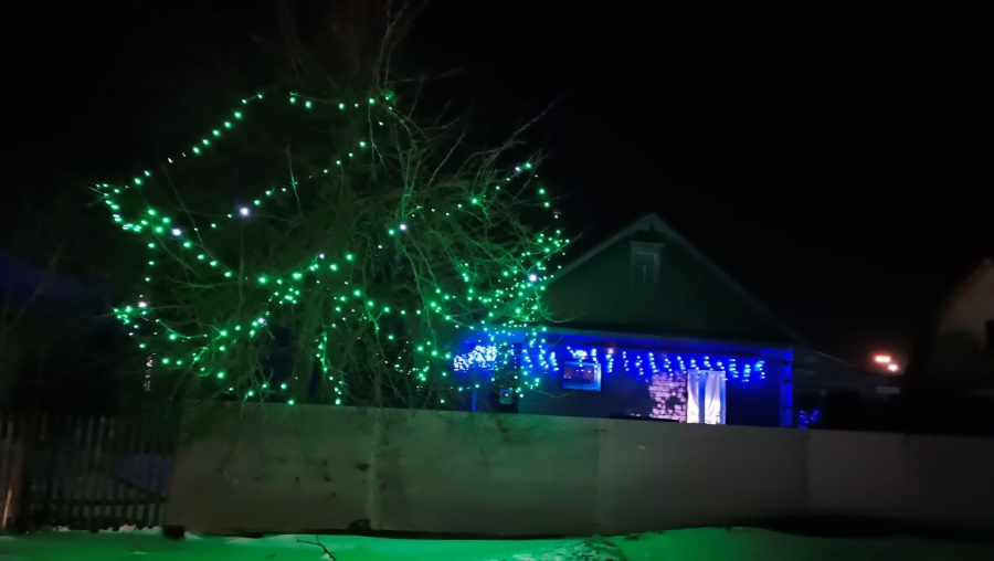 Один из местных жителей Алексей Ивойлочев сотворил новогоднюю сказку возле своего частного дома. Мужчина повесил большое количество гирлянд на забор и фасад здания, а на стену дома он через проектор вывел изображение Деда Мороза на санях, запряженных оленями. Перед участком сельчанин разместил две светящиеся фигуры снеговика и Деда Мороза, высота которых почти что в человеческий рост. Там же появились и украшенные елочки, подарки, шарики на лавочке и фигуры оленей.