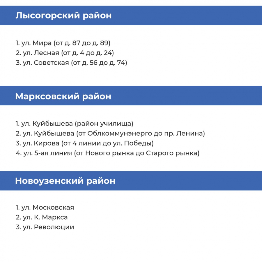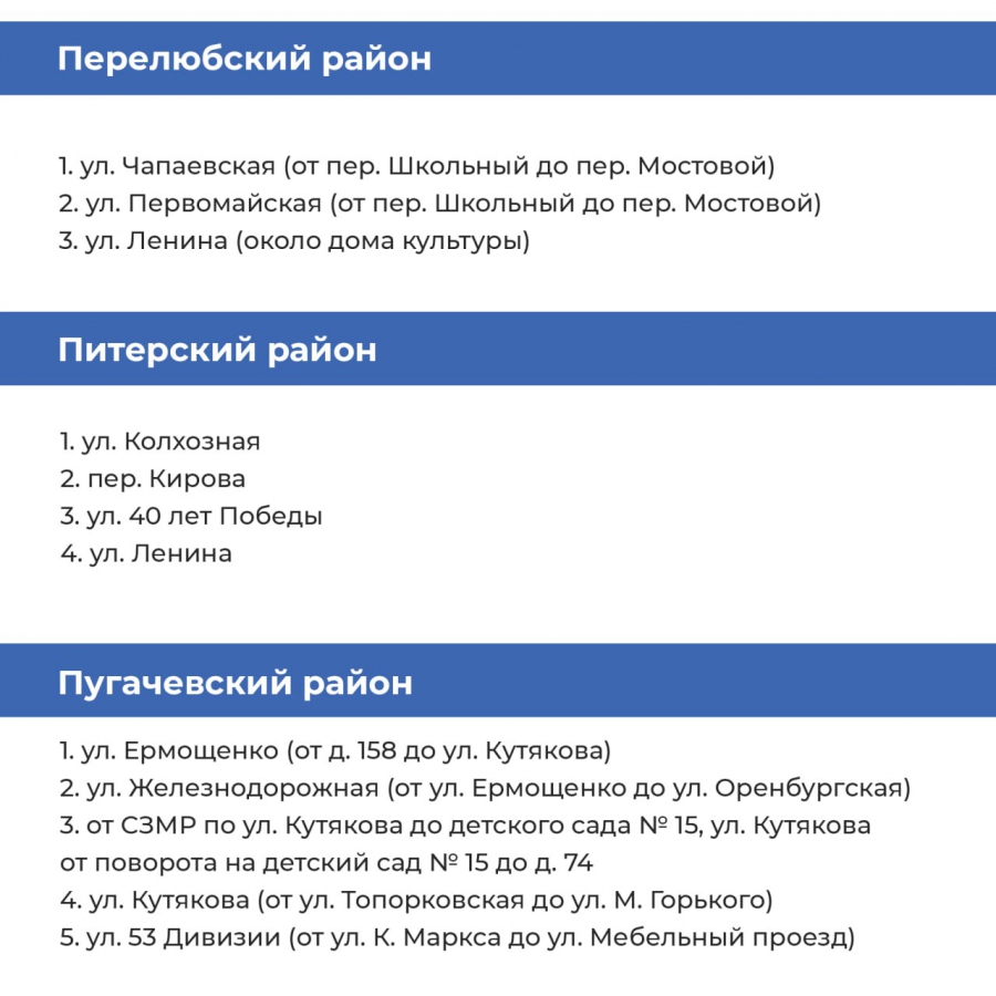 В этот раз списки пополнились рядом адресов в Лысогорском, Марксовском, Новоузенском, Перелюбском, Питерском и Пугачевском районах. С улицами можно ознакомиться на карточках.