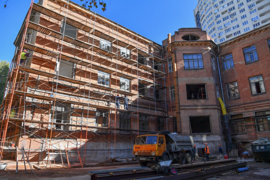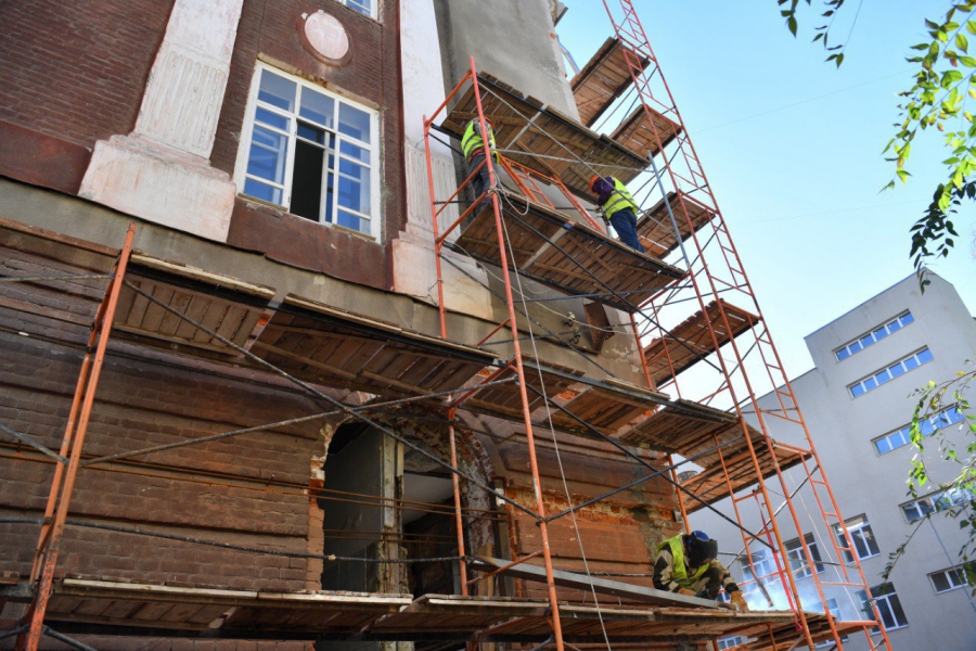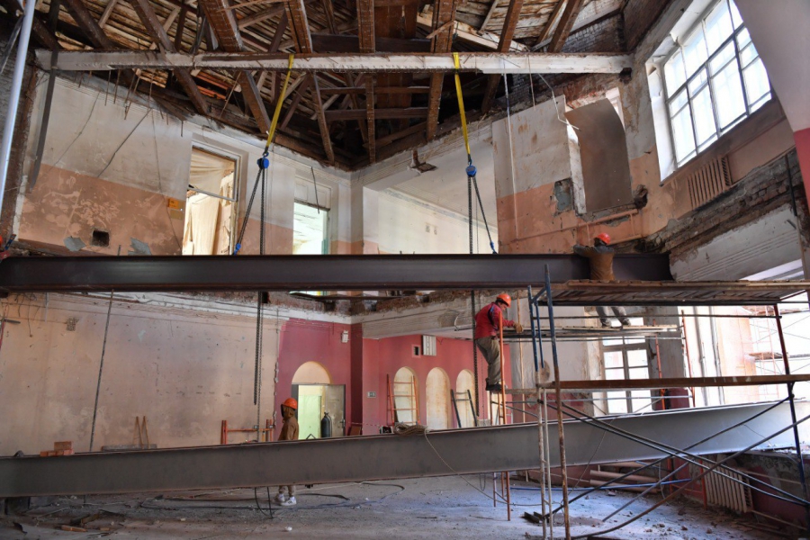 В настоящее время подрядчик занимается усилением фундамента, фасада, стен и оконных проемов, внутри помещения меняют изношенные межэтажные перекрытия. Зимой здание обеспечат теплом, чтобы не терять время и выполнять внутренние работы.