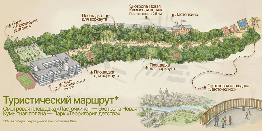Общественное пространство, с учетом реконструкции самого сквера «Территория детства», которая закончится в следующем году, и новой тропы, займет 10 гектаров. Экотропа откроет новые возможности не только для отдыха, но и для образования.