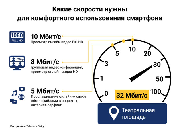 Эксперты TelecomDaily отметили, что скорость мобильного интернета билайн является самой высокой среди всех операторов на Театральной площади и составляет 32 Мбит/с. Так, отправка минутного видеоролика в мессенджере здесь займет всего 15 секунд, фото же улетит менее, чем за секунду. А свою прогулку по Набережной космонавтов можно даже транслировать в прямом эфире в качестве QHD* (1440р).