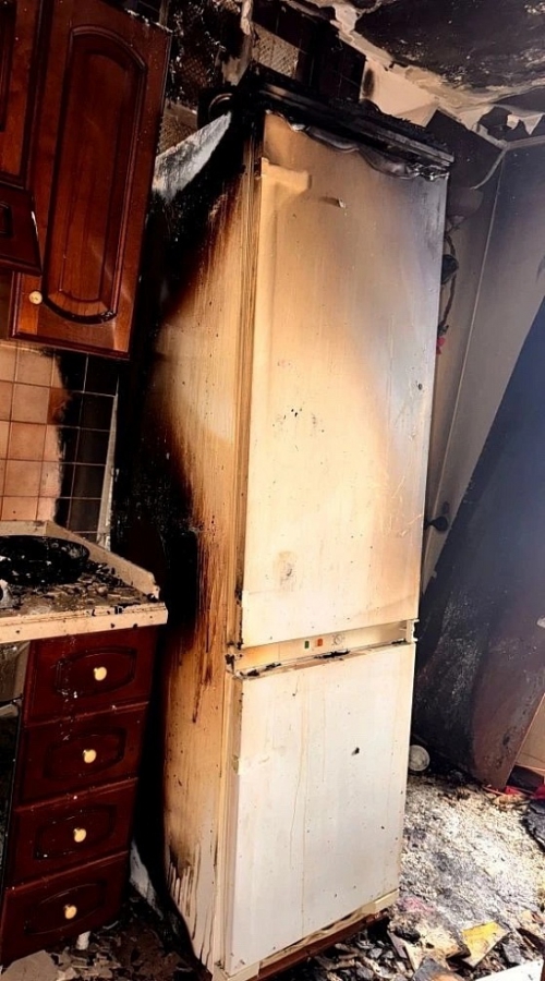 Предварительно, причиной пожара оказалась аварийная работа холодильника. На фотографиях также видно, что огонь частично охватил потолок.