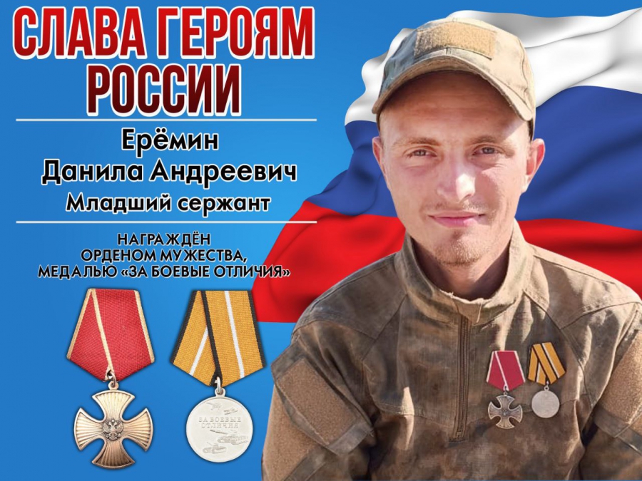 Данила Еремин проходит службу в звании младшего сержанта. По словам Галяшкиной, бойца на СВО наградили Орденом Мужества и медалью «За боевые отличия».