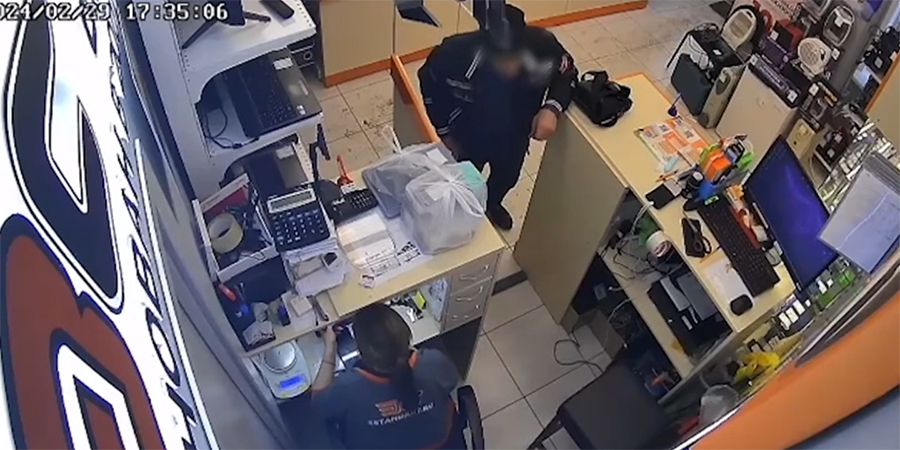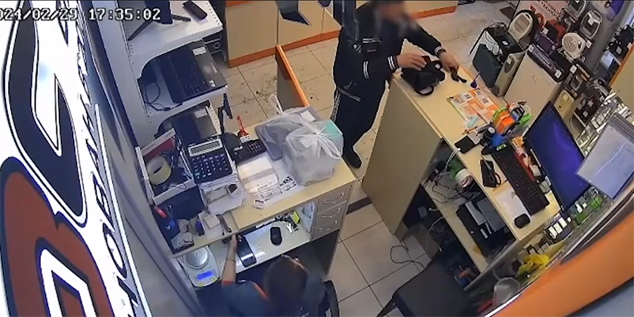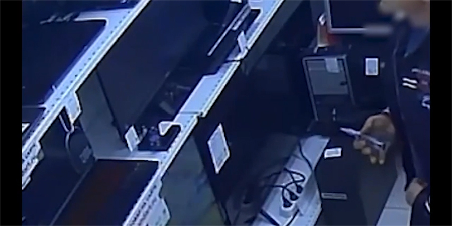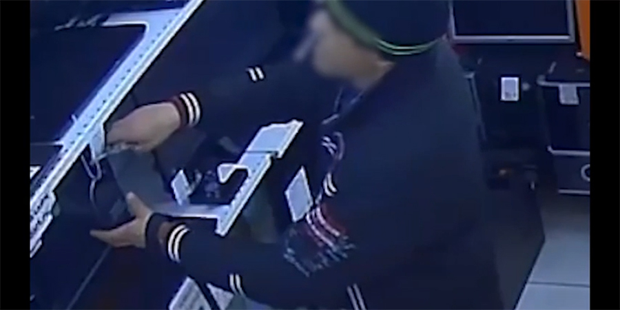 Момент кражи попал на камеру видеонаблюдения. На кадрах видно, как неизвестный мужчина сначала стоял около кассы, наблюдая за сотрудницей. Заметив, что женщина занята и за ним не смотрит, он переместился к соседнему столу и взял с него кабель, а потом засунул к себе в одежду. Потом с прилавка с помощью пассатижей он отцепил со стенда какой-то предмет (вероятно, геймпад) и также спрятал его. Его внимание также привлекла колонка, которую он быстро спрятал к себе в карман.