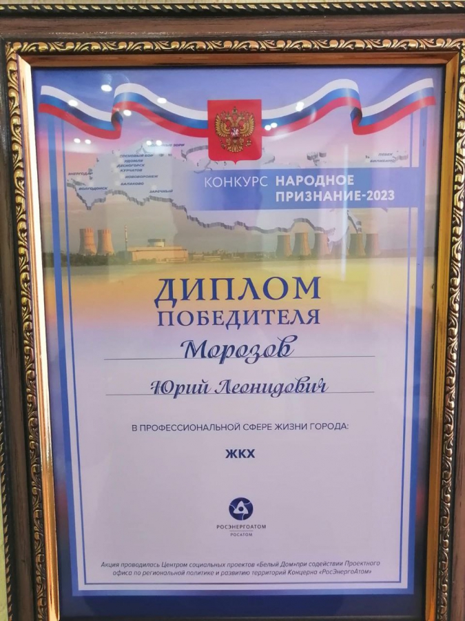 Одним из 20-ти победителей стал директор Балаковского филиала АО «Облкоммунэнерго» - Морозов Юрий Леонидович. Его многолетний труд в области электроэнергетики был по достоинству оценен жителями города.