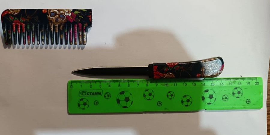 При осмотре ее сумки сработал ручной металлодетектор. Пристав попросил женщину показать содержимое. Среди предметов дамского обихода была выявлена расческа для волос со скрытым в рукоятке ножом с длиной лезвия 8 сантиметров.