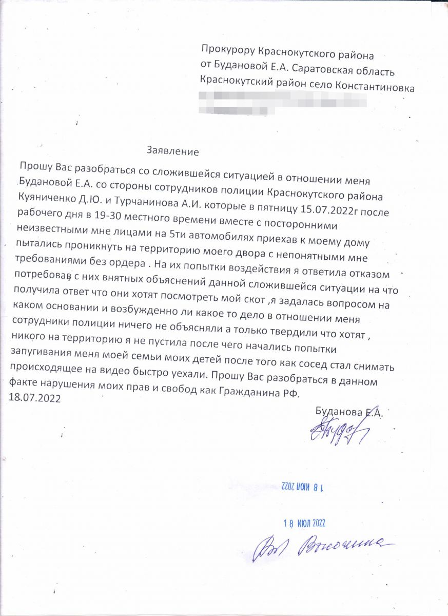 Женщина сразу заявила им, что не пустит без ордера. При этом, когда сосед достал телефон и стал снимать происходящее на камеру, гости ретировались. В понедельник ей принесли повестку, что ведется дорасследование. На следующий день в участковом отделении, куда ее вскоре снова вызвали, ее держали больше часа, а затем отвели к начальнику. Тот пообещал сельчанке «посадить на 15 суток» за то, что она препятствует ходу расследования. «Ты себе яму копаешь, у него все основания», - привела его слова саратовчанка. Ей начали говорить, что она не должна была брать к себе корову домой.