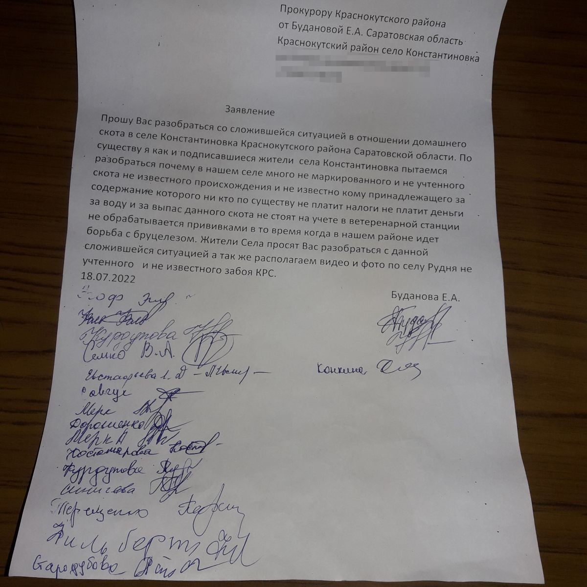 Елена также предоставила редакции обращение к прокурору Краснокутского района с подписями ряда местных жителей, где просит разобраться с ситуацией вокруг домашнего скота в Константиновке. Люди недоумевают, почему в селе много немаркированного и неучтенного скота неизвестного происхождения, не понятно, кому принадлежащего, за содержание которого никто по существу не платит деньги, ни за воду, ни за выпас. Скотина, говорится в обращении, не состоит на учете в ветстанции, не обрабатывается прививками, хотя в районе идет борьба с бруцеллезом.