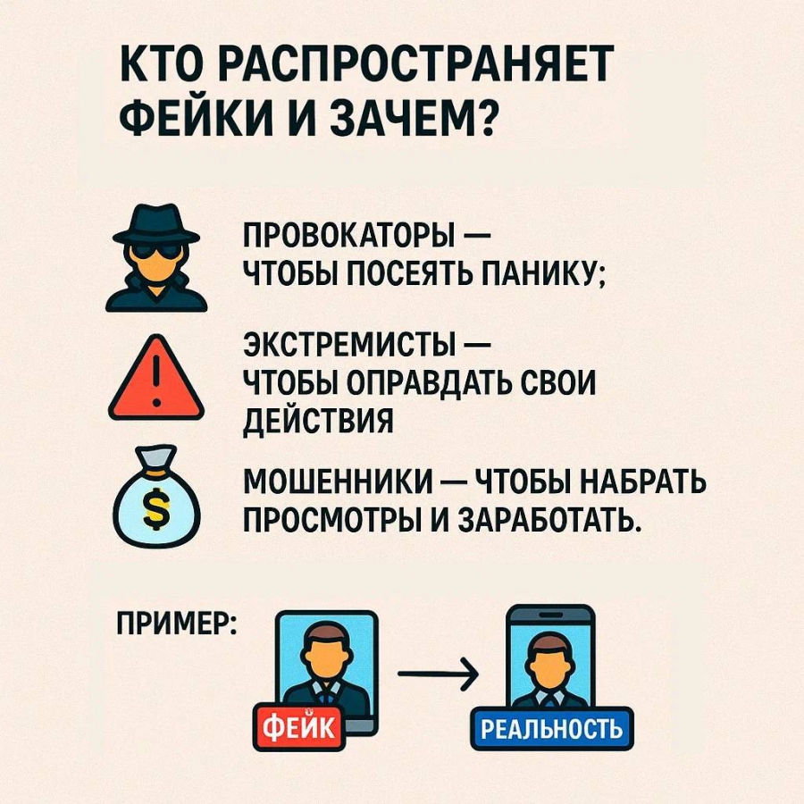 Фейки распространяются быстрее правды, манипулируют мнением и угрожают безопасности. Проверяйте информацию, прежде чем делиться.
