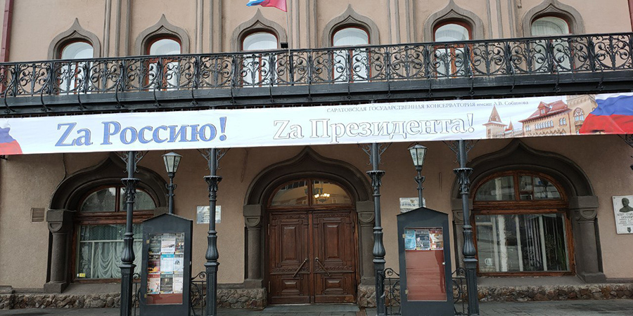 На фасаде консерватории разместили растяжку в поддержку главы государства и военнослужащих РФ, а также наших соотечественников с Донбасса с надписью «Zа Россию! Zа президента!». Тем самым учреждение подхватило инициативу коллектива Московского театра Олега Табакова, на фасаде которого в конце марта появился символ Z.