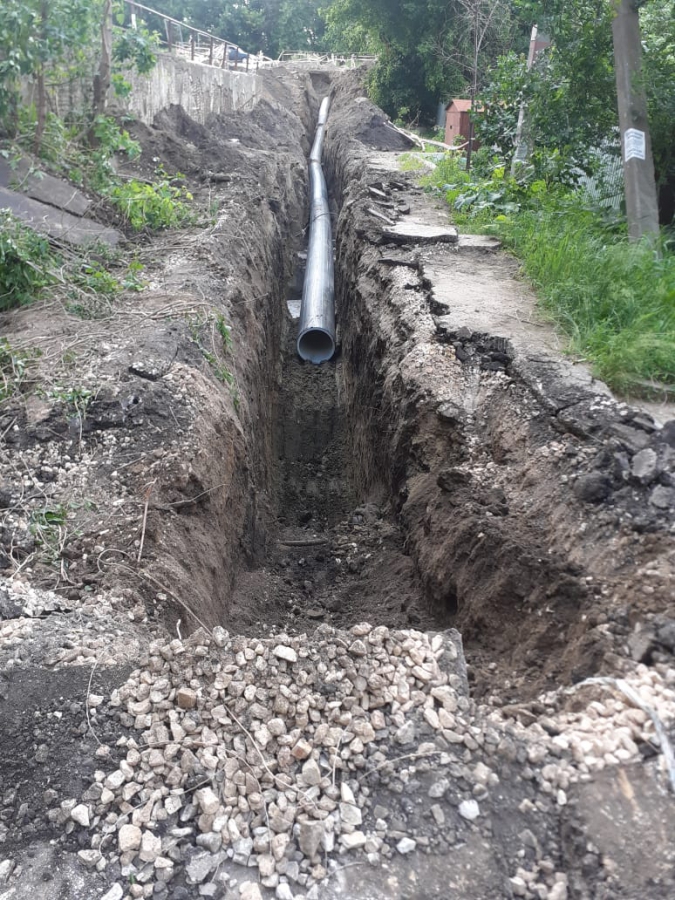 После проведения регламентных работ по опрессовке, промывке и дезинфекции обновленные водопроводные коммуникации пущены в работу. В настоящее время специалисты КВС проводят мероприятия по благоустройству территории. Далее, в соответствии с утвержденной дорожной картой, представители администрации района и комитета по строительству и инженерной защите городской администрации восстановят подпорную стенку.