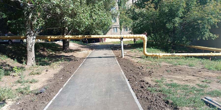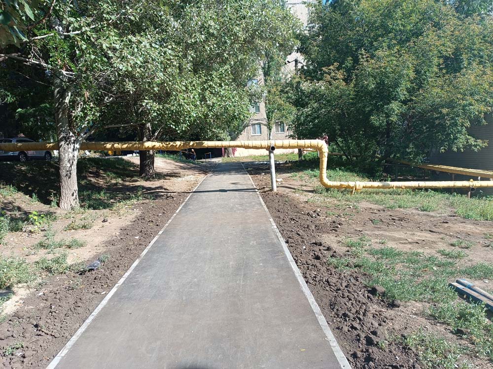 На благоустроенном тротуаре между отремонтированными дворами по 1-му Магнитному проезду, 2 и 4-му и 2-му Магнитным проездам пешеходам приходится беречь голову от низких труб.