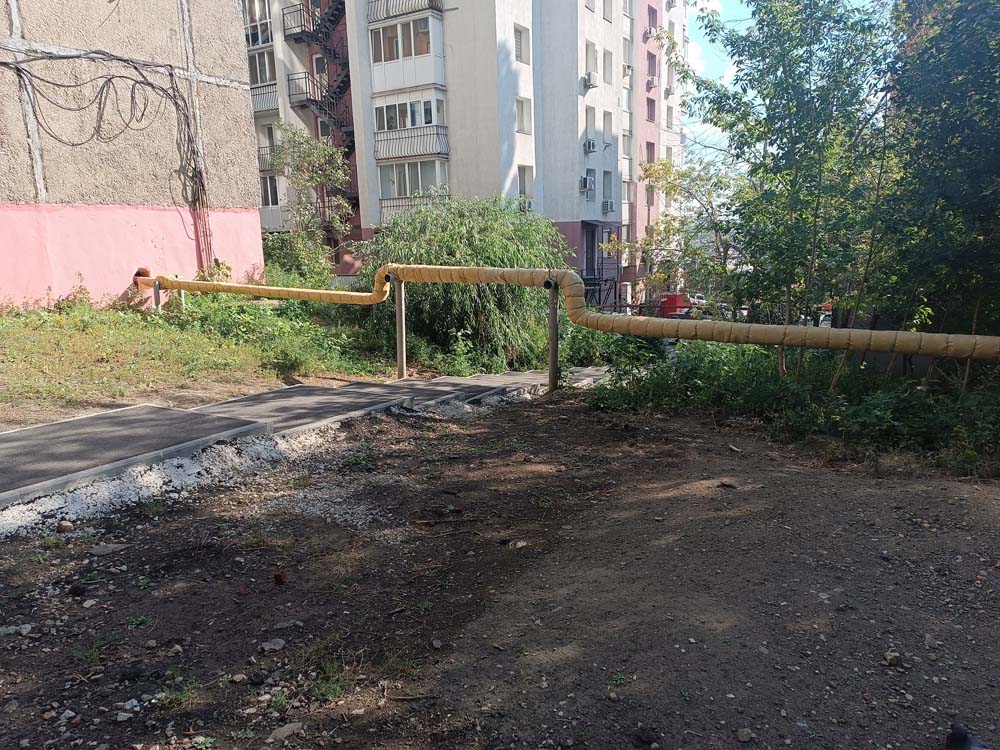 Низкие коммуникации были проведены здесь изначально. Одна пара труб перекрывает сам тротуар, а вторая - ступени, ведущие в гору от дома №4 к пешеходной зоне. Это создает неудобства для высоких людей и опасность для велосипедистов и самокатчиков.