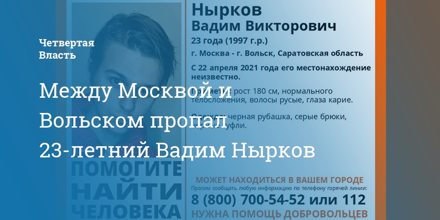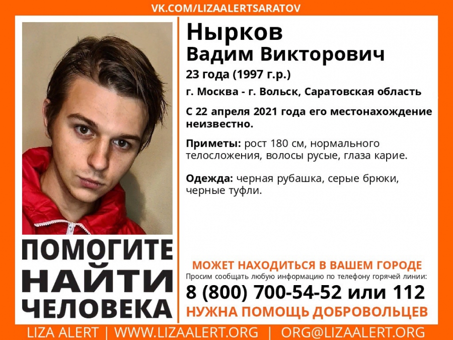 Между Москвой и Вольском Саратовской области без вести пропал 23-летний Вадим Нырков. Об этом сообщает поисковый отряд «Лиза Алерт».