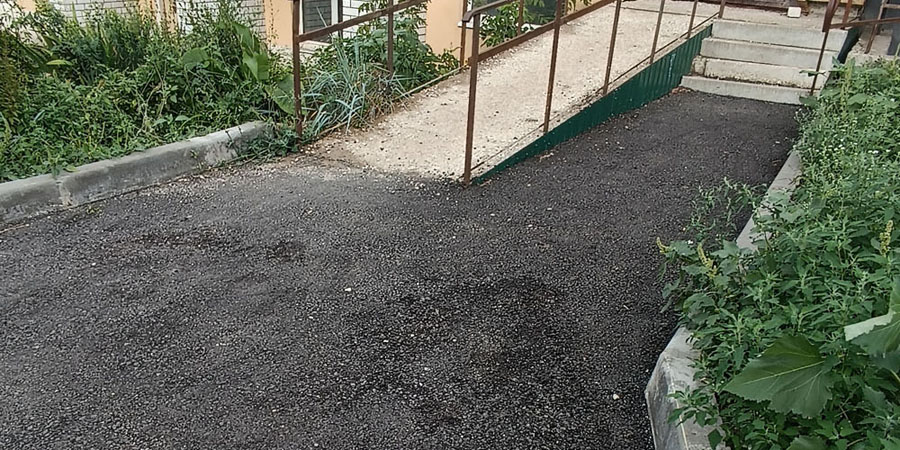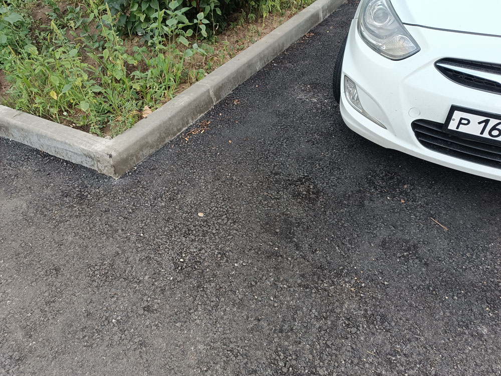 Такое покрытие не может быть принято и нуждается в переделке. Участки выкрашивания также можно встретить вдоль борта у третьего подъезда и на парковочном кармане за ним. Дефекты на входных группах, скорее всего, обусловлены тем, что уплотнение покрытия на них проводили виброплитами, которыми сложно добиться уплотнения дорожных типов асфальта.