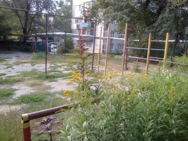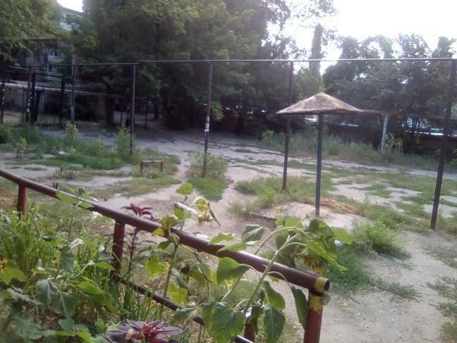 Судя по опубликованным фотографиям, территория имеет заржавевшие конструкции, отдаленно напоминающие элементы детской площадки. По сути, она состоит из старых ограждений, а также хаотично стоящих труб. Это украшается «грибком» от песочницы и раскрашенными шинами. Из-под не очень ровной асфальтовой площадки повсеместно пробивается трава, которая уже скоро может стать препятствием для пешеходов (местами ходить уже невозможно). С учетом разбросанного мусора и стекол, пребывание детей на такой площадке едва ли безопасно.