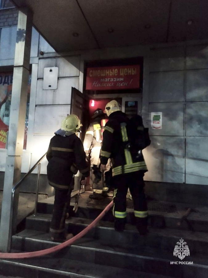 Сигнал о возгорании в пятиэтажном доме №96 по улице Большая Садовая (между 2-й Садовой и Беговой) поступил в 20.26. На место происшествия выехали три пожарных расчета. Они тушили пламя в магазине, расположенном на 1-м этаже.