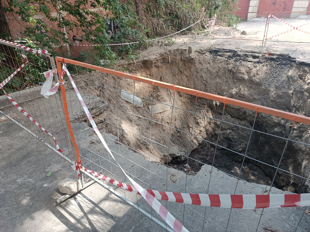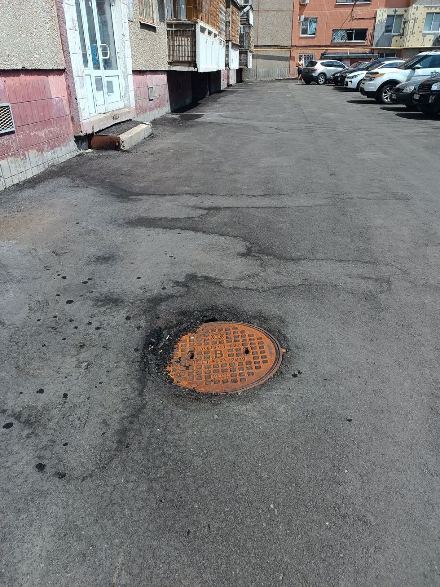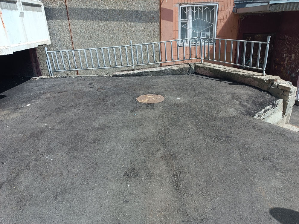 С обратной стороны дома начал проваливаться люк смотрового колодца: вокруг него уже образуется дыра. На площадке над первым подъездом сотрудники «Дорожного контроля» обнаружили обширный участок выкрашивания.