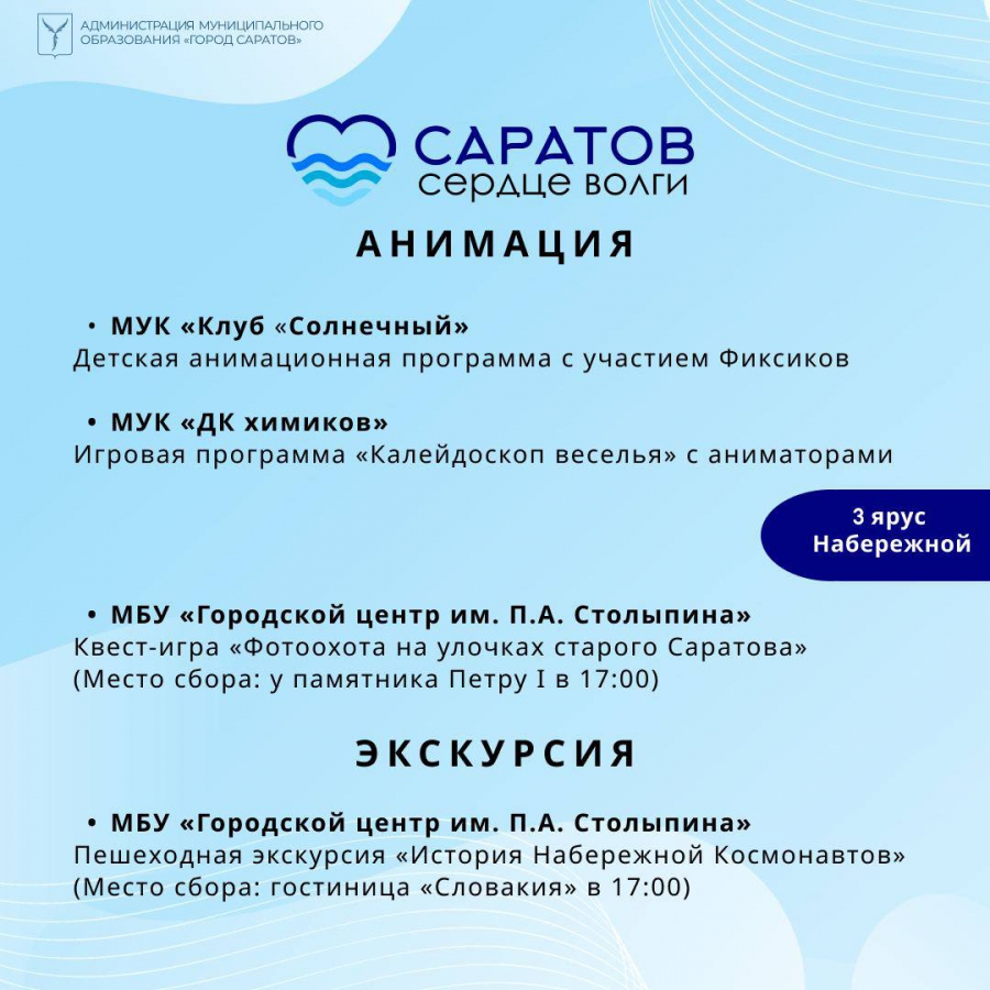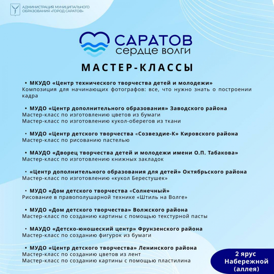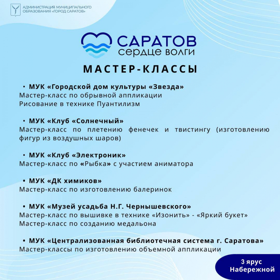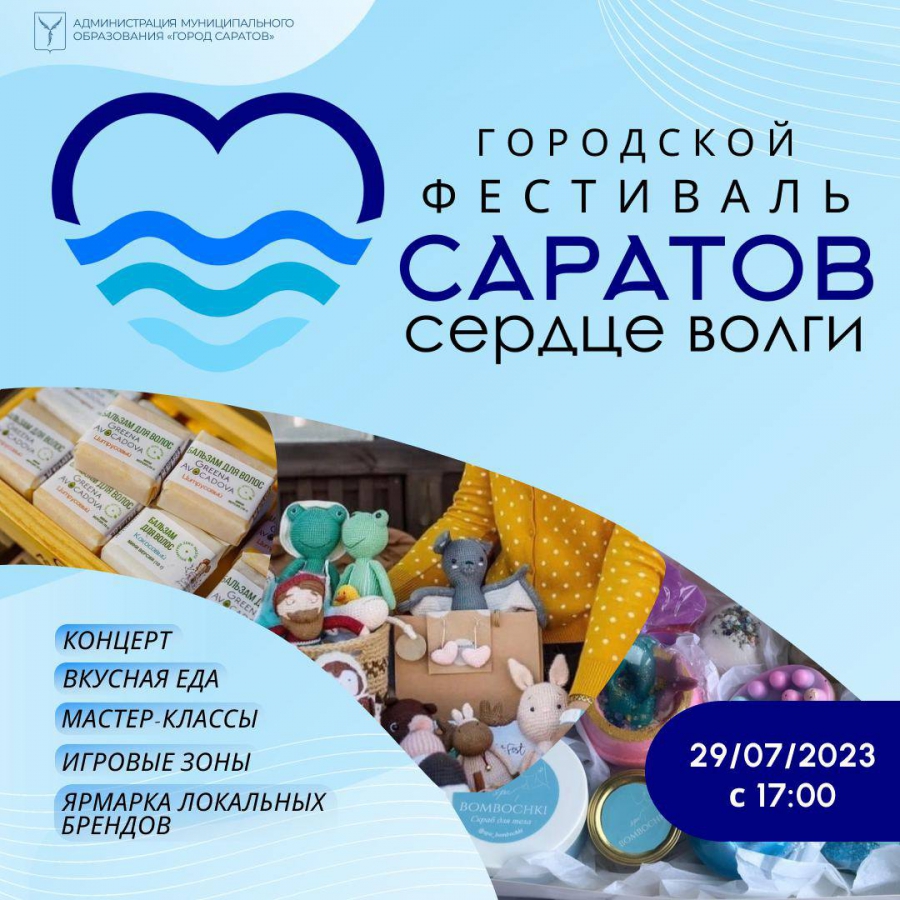 Завтра, 29 июля, на Набережной Космонавтов Саратова для всех желающих устоят мастер-классы и концерт под открытым небом. Как сообщили в администрации города, все мероприятия пройдут в рамках фестиваля «Саратов – сердце Волги».