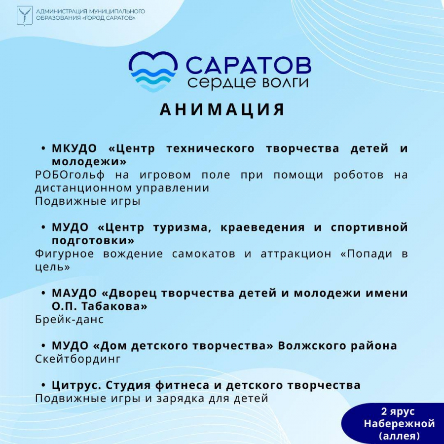Так, на набережной 2 и 3 ярус заполнятся точками по различным увлечениям. Горожане смогут попробовать сделать роспись медового пряника или изготовить магниты, создать балеринок или картину с помощью текстурной пасты. Там же пройдет РОБОгольф на игровом поле при помощи роботов на дистанционном управлении. Творческие объединения продемонстрируют брейк-данс и скейтбординг, а начинающие фотографы смогут узнать все о построении кадра. Кроме того, состоится пешеходная экскурсия, посвященная истории Набережной Космонавтов.