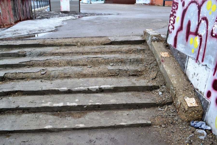 На опубликованных фото видно, что во внимании нуждается лестница у Ротонды. Так, ступеньки спуска полуразрушены – покрытие потрескалось, части основания отвалились.