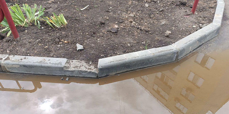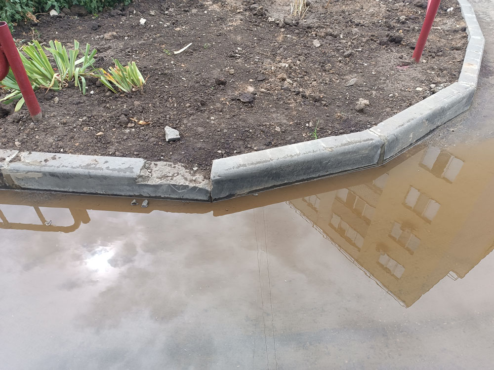 Напомним, в конце июля мы писали о том, что в обновленном дворе после проведения работ стоит огромная лужа, над которой возвышается битый бордюр. И то, и другое является дефектом, требующим устранения.