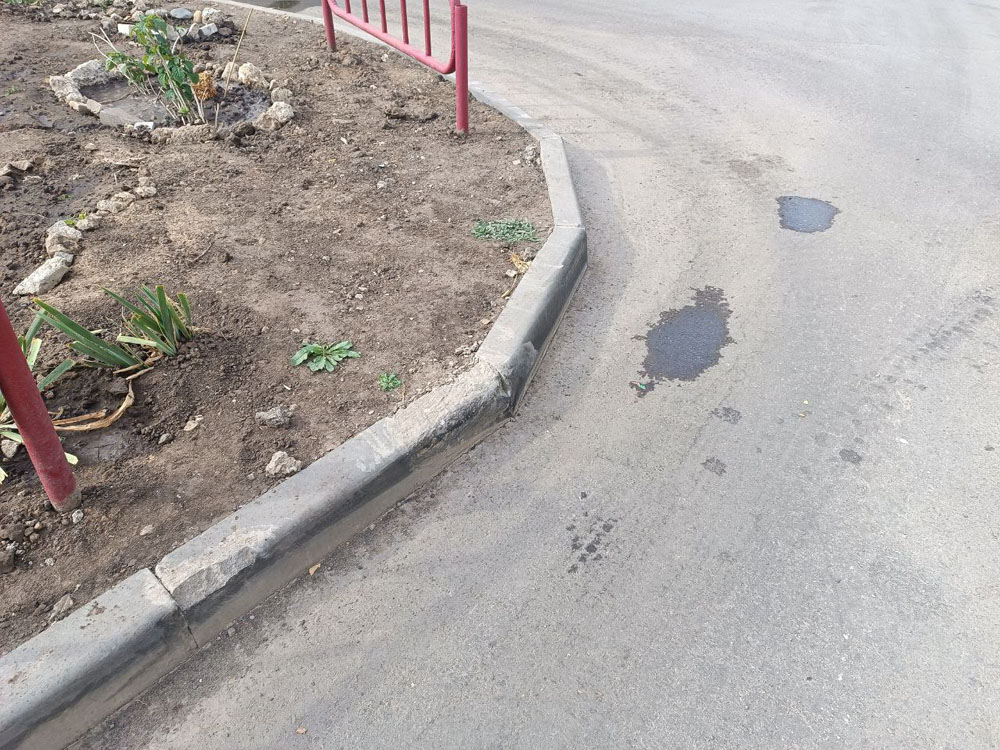Как показал наш новый визит во двор, исправления коснулись только бортового камня, который заделали раствором. При этом на отреставрированном бордюре появился уже новый скол, оставленный без внимания. На асфальте же каких-либо изменений вообще не произошло, а это значит, что большая лужа продолжит образовываться после дождей и оттепелей.