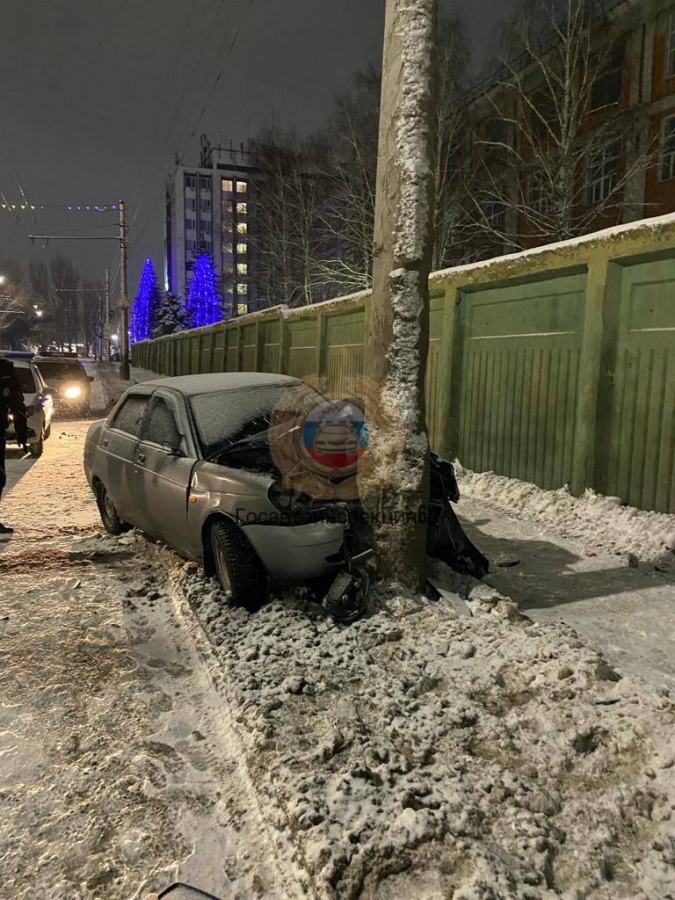 На Панфилова ночная поездка на «Приоре» закончилась ДТП со столбом