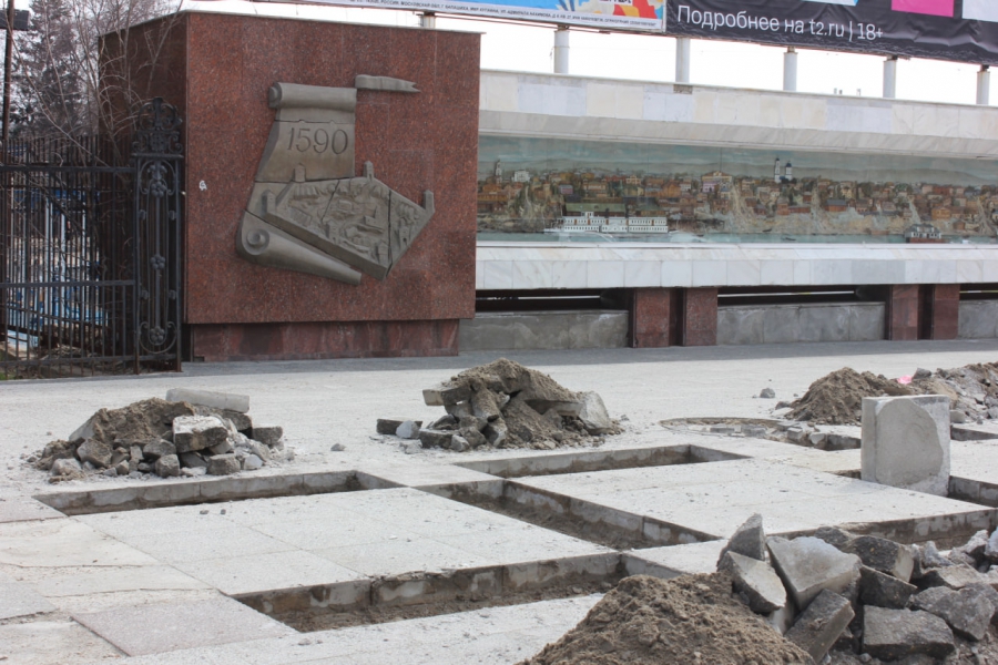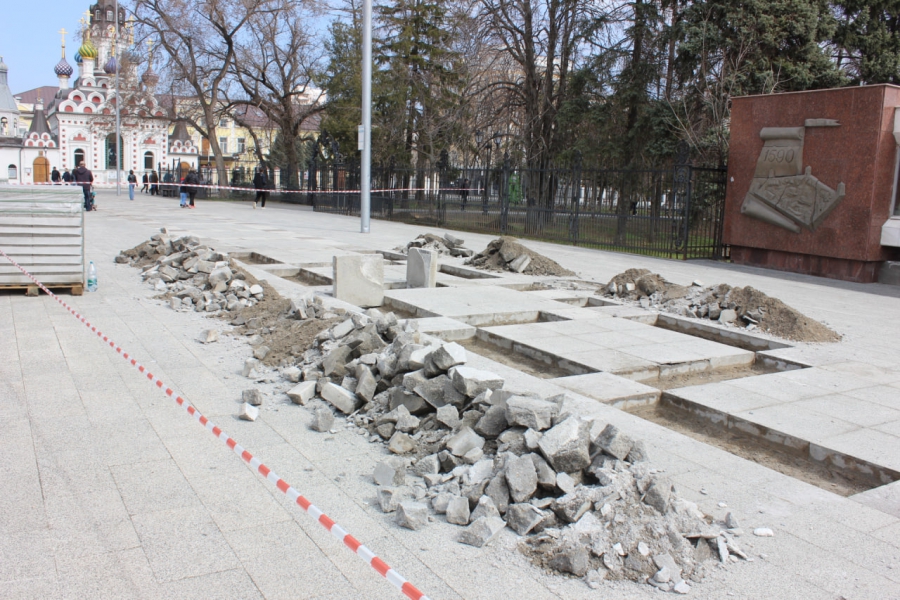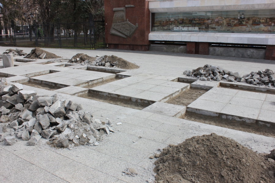 Пока что в рамках проведения работ извлекли часть плит, которые пришли в негодность, рядом образовались кучи с землей и камнями. Тут же стоят стопки с дорожным покрытием, которое поставят на замену.