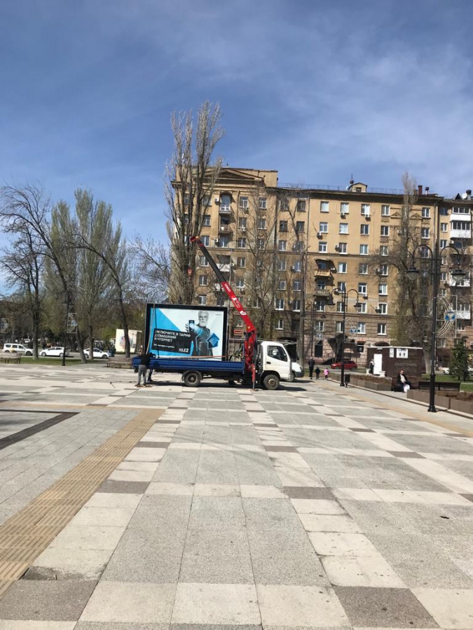 На фотографиях видно, что рабочие сняли и погрузили в грузовик баннер с рекламой интернета. Они также вытащили из плитки основание конструкции.