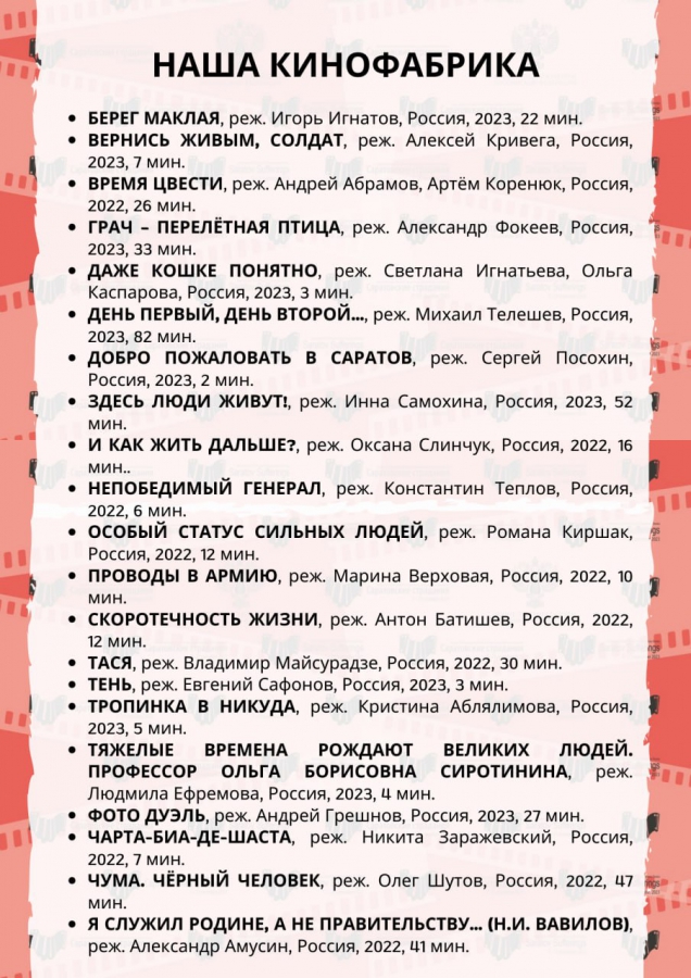 Все работы организаторы фестиваля распределили на 5 конкурсных номинаций. Откроются «Саратовские страдания» показом фильмов саратовских режиссеров. Всего в конкурсе «Наша кинофабрика» соревнуется 22 киноработы.