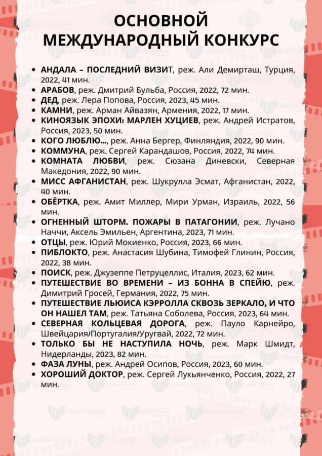 Основная программа пройдет с 8 по 11 сентября в большом зале Дома кино. В эти дни зрителям покажут 20 лент из России, Турции, Армении, Финляндии, Северной Македонии, Афганистана, Израиля, Аргентины, Италии, Германии, Швейцарии, Нидерландов.