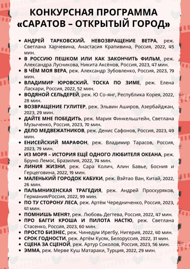 В номинации «Саратов – открытый город» также представлено 20 документальных фильмов. Свои работы на конкурс прислали участники из Россия, Азербайджан, Республика Корея, Бразилия, Босния и Герцеговина, Китай, Германия, Нигерия, Беларусь, Турция. Фильмы этой номинации продемонстрируют с 9 по 11 сентября в малом зале Дома кино.