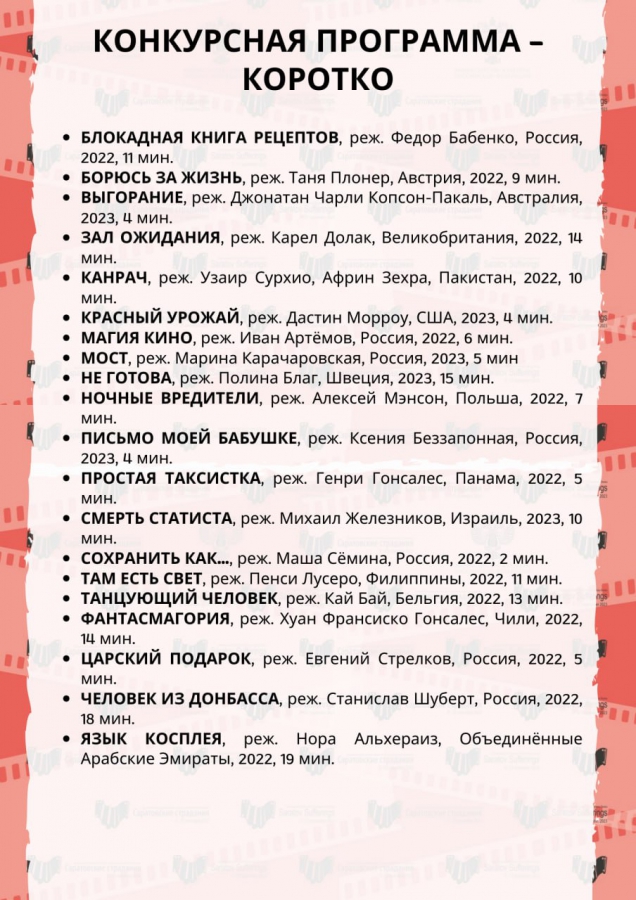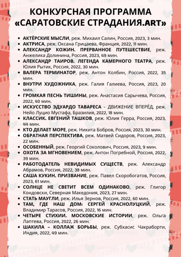 Запланирован во время фестиваля показ фильмов отдельной программы «Коротко». В нее вошли 20 работ из России, Австрии, Австралии, Великобритании, Пакистана, США, Швеции, Польши, Панамы, Израиля, Филиппин, Бельгии, Чили, ОАЭ. Фильмы планируют показывать на различных площадках города, победителя определят путем голосования. Также зрители определят лучшие работы в номинации «Саратовские страдания .ART». В нее вошло 20 картин об искусстве из России, Франции, Бразилии, Северной Македонии, Индии. Фильмы можно будет увидеть на показах в Театральном институте Саратовской государственной консерватории имени Собинова, в Саратовском художественном училище имени Боголюбова и в Доме-музее Кузнецова.