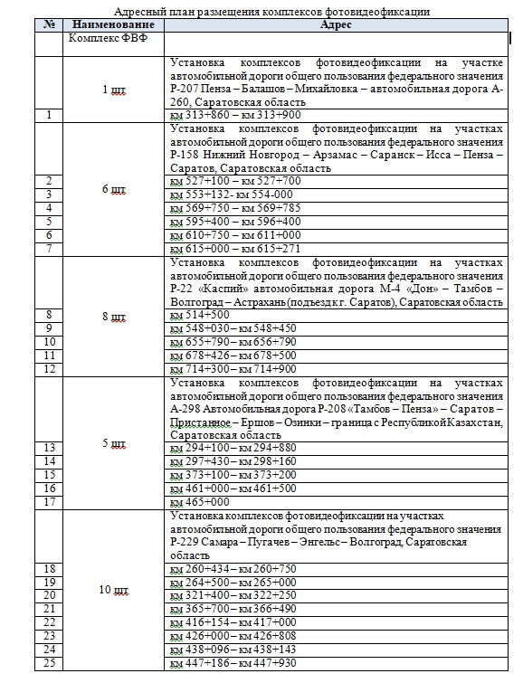 - 8 камер - Р-22 «Каспий» автомобильная дорога М-4 «Дон» — Тамбов — Волгоград — Астрахань (подъезд к г. Саратов).