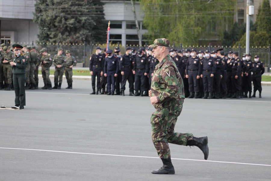 Участники шествия под музыку проходили по площади коробками, а генерал-майор следил за ними, особенно он похвалил бойцов ФСИН и казаков, а поругал МЧС. Во время звучания Гимна России солдаты палили вверх из автоматов холостыми патронами.