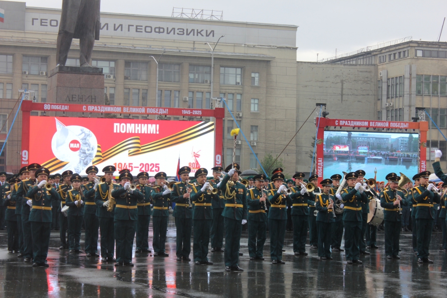 Закончилось шествие выступлением военного оркестра с песней «День Победы», акробатическими танцами и взрывом хлопушек.