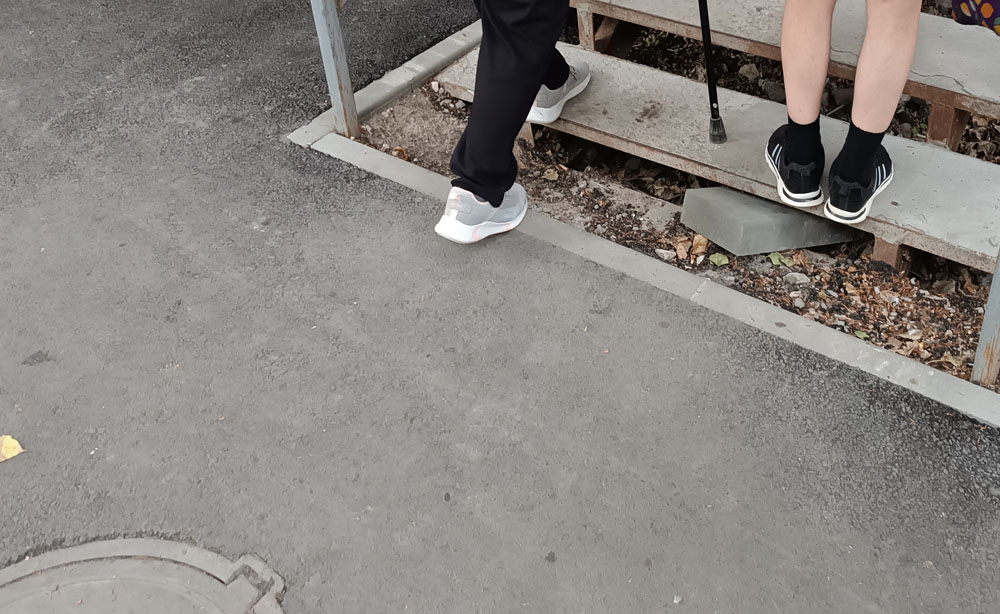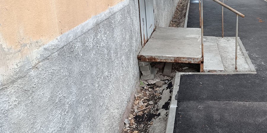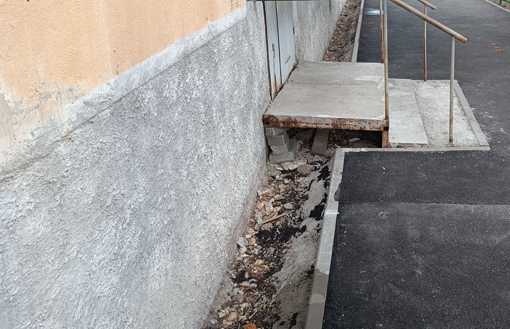 Еще одним негативным результатом ремонта стало опасное обустройство крыльца 3-го подъезда. Тротуар здесь не подходит вплотную к ступеням крыльца, а образует разрыв шириной более 20 см с углублением. Маломобильные жильцы дома вынуждены «перепрыгивать» образовавшееся препятствие и просить помощи, чтоб зайти на крыльцо.