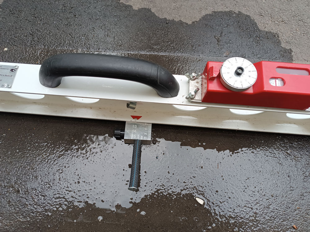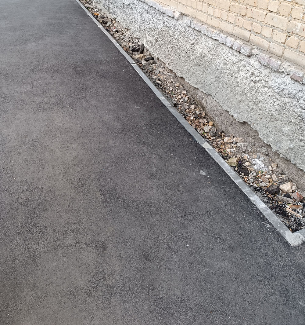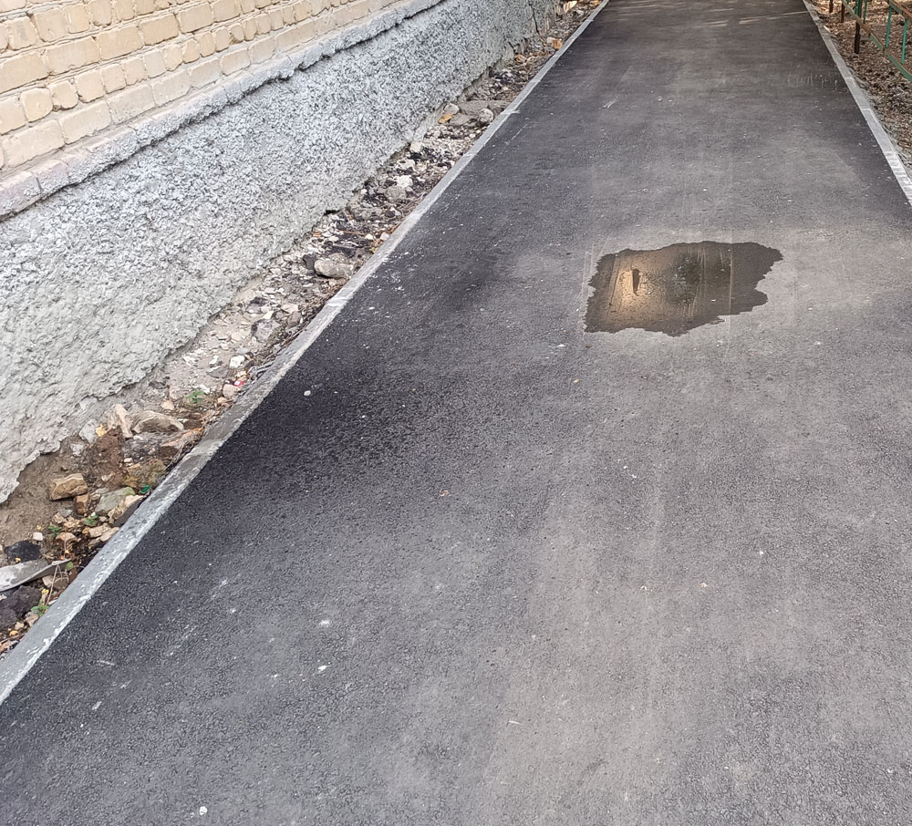 Также на тротуаре присутствует просадка, где стоит вода. При измерении рейкой глубина просадки составляет 12 мм, что не соответствует допустимым требованиям по нормативу. Кроме этого, во дворе не выполнена обратная отсыпка грунтом бортового камня.