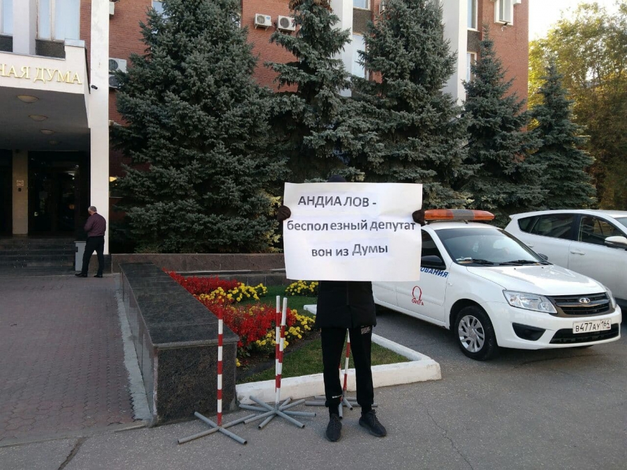 Еще один плакат посвятили главе фракции КПРФ в региональном парламенте: «Анидалов – бесполезный депутат вон из Думы».