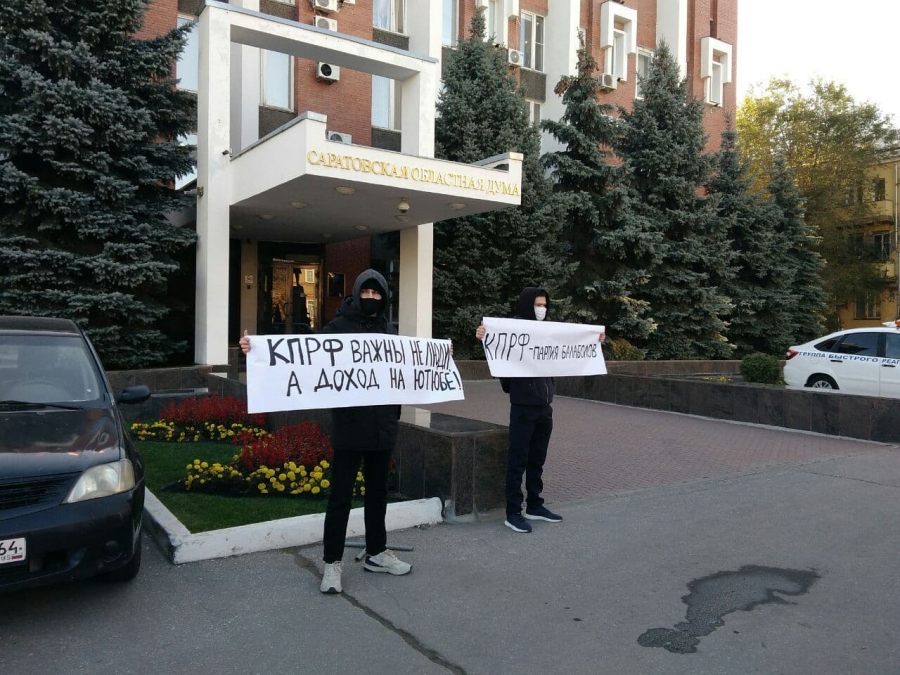 Сегодня, 27 октября, перед зданием Саратовской областной думы появились трое молодых людей с антикоммунистическими плакатами. Свидетелем этого стал корреспондент «Четвертой Власти».