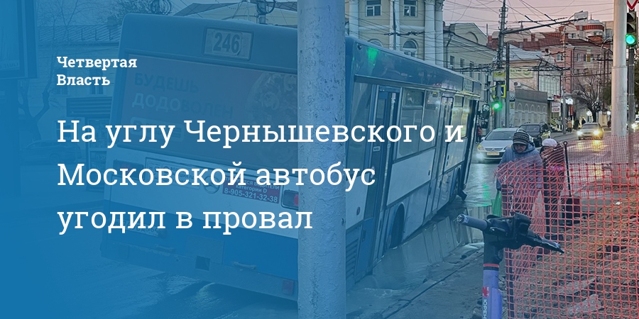Автобус угодил в провал правым задним колесом на перекрестке Чернышевского и Московской. Судя по кадрам, яма наполнена водой, поэтому выход через среднюю дверь оказался заблокирован. На опубликованных фотографиях на тротуаре видны ограждения. Очевидно, там проводятся какие-то коммунальные работы.