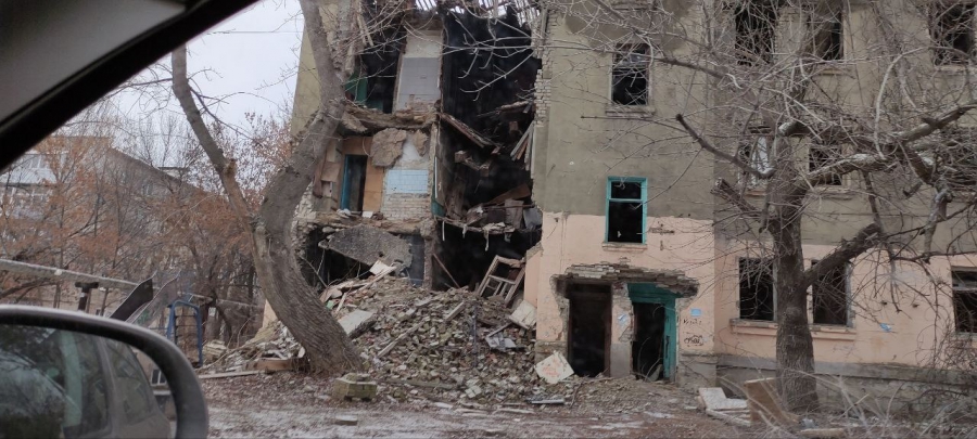 На фото видно, что во дворе есть рассыпающайся буквально на глазах многоквартирный дом, который никак не огорожен. Он - аварийный и в нем никто не живет, но само здание несет в себе угрозу. Часть дома разрушена, внутри многоэтажки зияет огромная дыра. У основания валяется груда кирпичей и балок, с козырька свисает кусок цементного пласта, который вот-вот отлетит. Добавим, что нередко подобные объекты привлекают внимание любопытных детей, а это грозит несчастными случаями.