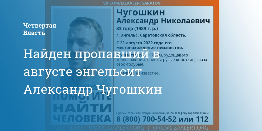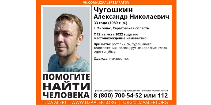 С 22 августа Александр Чугошкин 1989 г.р. перестал выходить на связь, и его местонахождение оставалось неизвестным. Спустя почти 2 месяца совместных поисков его обнаружили в Энгельсе живым.