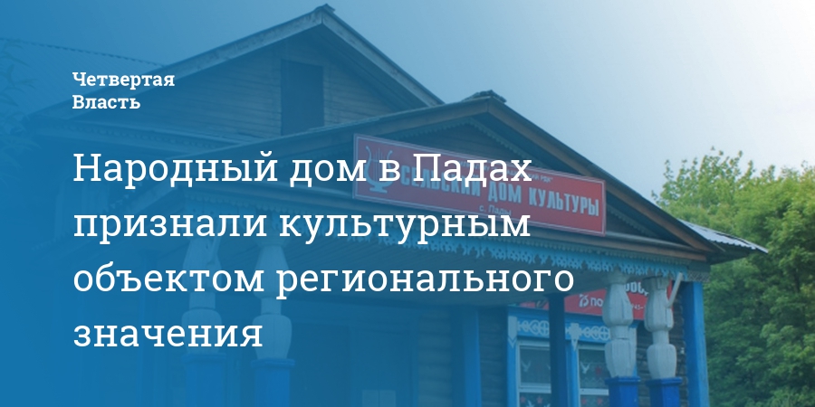 Объектом регионального значения признан «Народный дом 1901 года», который находится в селе Пады (Ленина, 1). Кроме того, управлением по охране объектов культурного наследия утвержден предмет охраны здания. В список выявленных памятник внесен в 2020 году, затем он прошел историко-культурную экспертизу. Лицензированным специалистом Екатериной Тупаловой было рекомендовано включить объект в Единый государственный реестр в категории регионального.