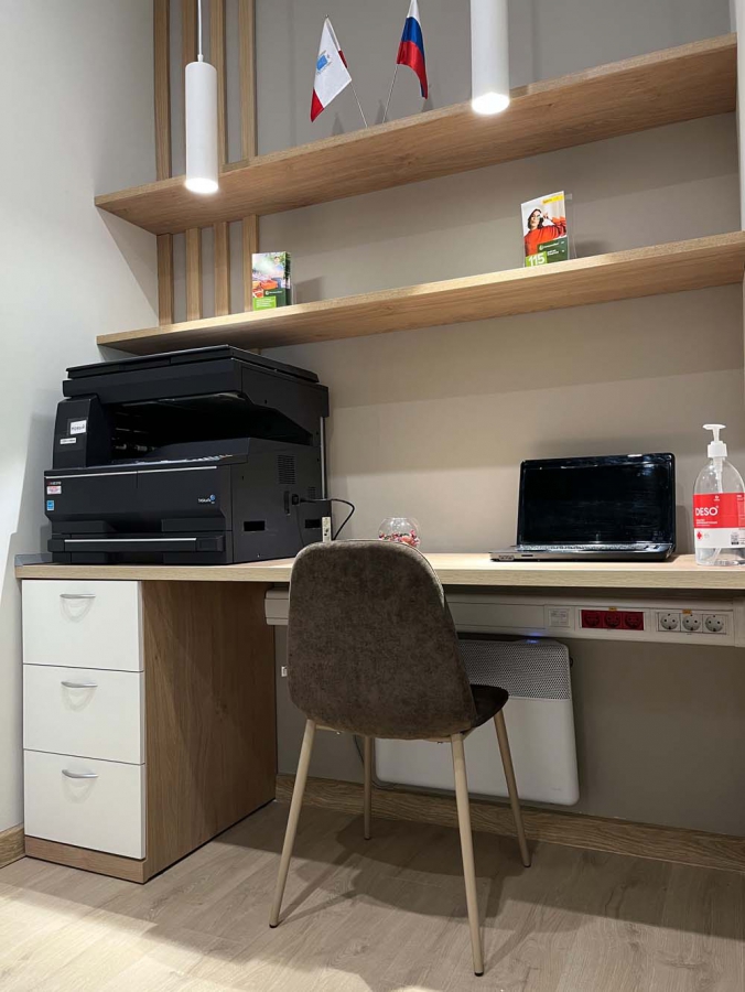 Внутри Центр поделен на зоны: банковского сервиса, включающего в себя места работы менеджеров, банкомат, информационно-платежный терминал и электронную очередь; рабочую зону с бесплатной сетью Wi-Fi и зарядками для телефонов; «уголок здоровья», где организовано дружество медицинской сестры, а также обеспечена возможность проведения вакцинации, измерения давления и отдыха. Помимо этого, в Центре есть отдельная переговорная для деловых встреч, доступная для бронирования, и кабинет для самостоятельной работы клиентов, оборудованный компьютером. Также в офисе предусмотрена работа помощника нотариуса. Кроме того, для удобства посетителей в Центре деловой активности установлен кофейный автомат.